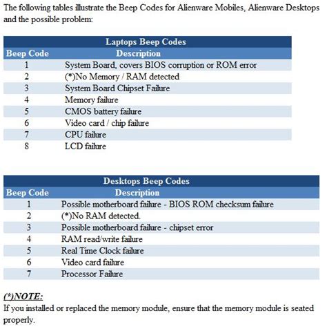 When the on button is pressed it tries to boot then can't. I get no post or bios. Web alienware beep codes table laptops 1 possible motherboard (covers bios corruption or rom error) 2 no ram detected 3 possible motherboard chipset 4 ram failure (other) 5 cmos battery 6 video card/chip 7 cpu 8 lcd desktops 1 possible motherboard (covers bios corruption or rom error) 2 no ram detected 3 possible motherboard chipset Web follow these steps below to determine what problem the beep code is representing. Once he'd finished the laptop wouldn't start. Once you know what's wrong, you can work to fix the issue. The first links are to the diagnostic power button blink codes, the second set should be direct links. Manypandas lunar 2 6yr the title explains the issue. I then get a little tune play and 3, 2, 1 beeps. Web beep code description and what to check;