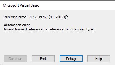 Automation Error Invalid Forward Reference. Web invalid forward reference, or reference to uncompiled type error; Whereby when we run this macro on another version of ms office (2007 & ms office professional plus 2016) we did not encountered this issue.